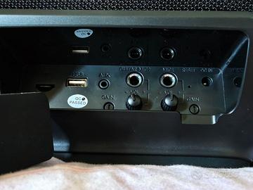 Completissimi gli ingressi: Bluetooth 5.3 TWS (true wireless stereo), classica USB Type A (per le nostre chiavette USB), ingresso AUX jack audio da 3.5mm, TF/SD card e USB Type C per la ricarica (caricatore incluso da 30W). Troviamo anche due ingressi aggiuntivi, uno per il microfono e l’altro per la chitarra. Questi due ingressi sono accessibili tramite cavo Jack 6.35mm e vi permetteranno di aggiungere voce e chitarra con volumi separati. Infatti troverete 2 piccole manopole che vi permetteranno di aumentare e diminuire il volume di questi ingressi. Quindi Possibilità anche di utilizzo come Karaoke! Qualora voleste utilizzare 2 microfoni sarà possibile farlo poichè l’ingresso per chitarra può essere utilizzato anche con un microfono.