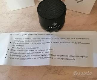 Speaker Wireless brandizzato Vipra, di colore nero, con manuale d’uso.