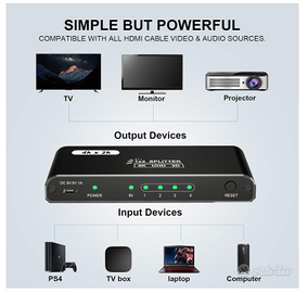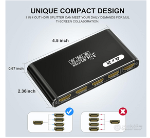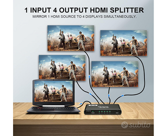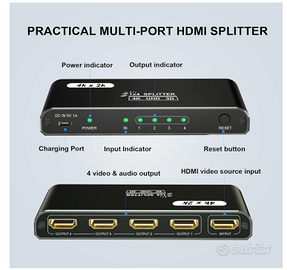 Splitter HDMI 1 in 4 Out 4K UHD – Duplica su 4 Schermi Vendo splitter HDMI 1x4, perfetto per duplicare lo stesso segnale video su più schermi contemporaneamente. Ideale per casa, ufficio, gaming o presentazioni 📺💻 📌 Descrizione prodotto: Splitter HDMI con 1 ingresso e 4 uscite che permette di trasmettere lo stesso contenuto su 4 display senza perdita di qualità. Attenzione: supporta solo duplicazione (specchio), NON estensione dello schermo. 💡 Caratteristiche principali: ✔️ 1 ingresso HDMI → 4 uscite HDMI ✔️ Supporto risoluzione fino a 4K@30Hz 🎥 ✔️ Compatibile con 3D, UHD e Full HD 1080p ✔️ Supporta HDMI 1.4 e precedenti + HDCP 1.4 ✔️ Audio compatibile Dolby TrueHD e AC3 🔊 ✔️ Alimentazione inclusa per segnale stabile 🔗 Ampia compatibilità: Funziona con moltissimi dispositivi: ➡️ Console (PS3, PS4, Xbox) 🎮 ➡️ Fire Stick, decoder, TV box ➡️ Lettori DVD/Blu-ray ➡️ PC e laptop E compatibile con: TV, monitor e proiettori 📺 ⚙️ Facile da usare: Nessun driver richiesto! Basta collegare ingresso e uscite e funziona subito 👌 🧱 Design e materiali: Struttura compatta e resistente in lega di alluminio, occupa poco spazio ed è facile da trasportare 💼 📦 Condizioni: Nuovo 📍 Consegna: Spedizione veloce