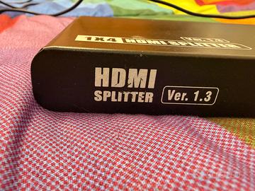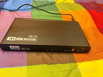 Splitter HDMI. 1 ingresso 4 uscite. Consente di dividere il segnale audio video da una sorgente e inviarlo a 4 utilizzatori differenti. Ideale per collegare fino a 4 tv ) esempio 2 camere ,cucina e sala )allo stesso decoder o ad altra sorgente.