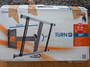 Vendo staffa TV girevole che permette di ruotare fino a 180° (90° a destra e 90° a sinistra) e di inclinarsi in avanti fino a 20°, soli 3,5 cm di spazio che lasciano fra la TV e la parete. Sistema interno di gestione dei cavi permette di tenere i cavi nascosti. Si adatta perfettamente a televisori da 40 a 65 pollici (102-165 cm) con uno spessore massimo di 5 cm. Può anche essere allontanato dalla parete di un massimo di 63 cm.