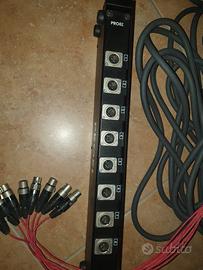 Questo dispositivo è unastage box audio Proel EBN8(spesso chiamata "ciabatta da palco"), utilizzata per gestire molteplici segnali audio in contesti live o di registrazione.