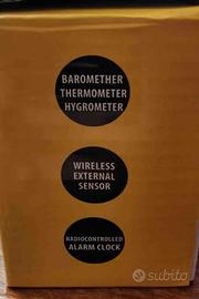 Stazione Meteo con Display a Colori, sensore esterno e meteo, data, orario, temperatura dell’aria interna/esterna, percentuale di umidità e pressione atmosferica Orologio radiocontrollato 12/24h dotato di barometro HPA con indicazione digitale della pressione atmosferica e indicazione ad icone della previsione meteo Termometro digitale interno/esterno in gradi °C/°F con memorizzazione della temperatura e umidità min/max della giornata e sensore senza fili per rilevazione esterna della temperatura e umidità Grande display a colori LCD da 16 cm di diagonale Dimensioni: 175x80x30 mm - Alimentatore 230V 50Hz / 5V 1A in dotazione per illuminazione continua.