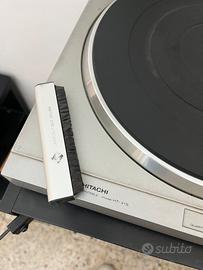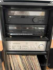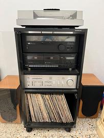 Stereo in ottimo stato funzionante completo di casse e armadietto porta-stereo con rotelle. I vinili della foto non sono inclusi in questa vendita.