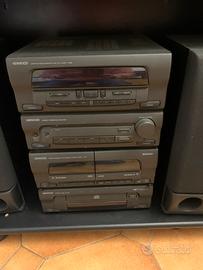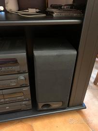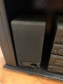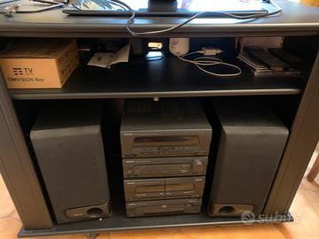 Vendo stereo kenwood anni 90,con lettore cd 2 riproduttori di musicassette,radio fm am ed equalizzatore con 2 casse stereo,insiemo formisco mobile porta tv r porta stereo nero in legno