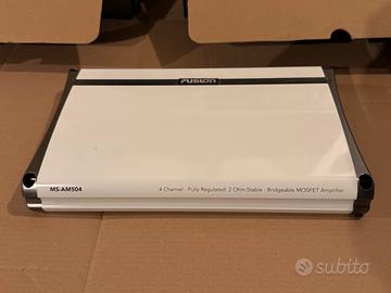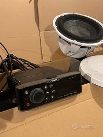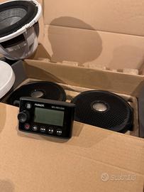 Stereo funzionante completo per imbarcazioni marca Fusion che comprende: -Radio modello MS-AV755 con Bluetooth e mascherina di protezione -Modulo rimando per consolle modello MS-NRX 300 con mascherina di protezione -Amplificatore 4 canali modello MS-AM504 -N°4 altoparlanti 7,7” 260 WATTS modello MS-FR7021 -N°1 Subwoofer 10” 450 WATTS modello Signature Series Impianto del valore da nuovo di oltre euro 1500
