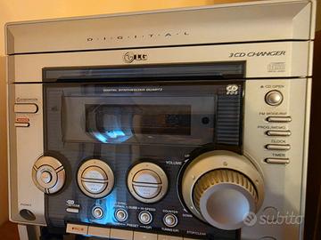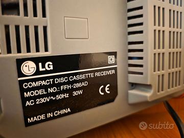 Marca: LG Modello: FFH-286AD Radio AM e FM. Con vassoio per 3 CD e doppio lettore di music-cassette. Sistema audio XDSS. Due vie di altoparlanti, 10W per via. Ingresso RCA ausiliario per collegare altri dispositivi. Colore: argento