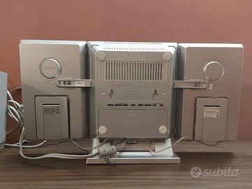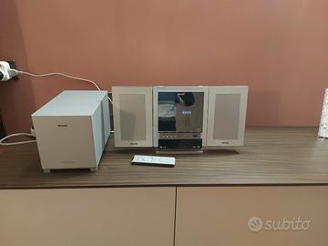 Stereo di marca originale con subwoofer, funzione radio, lettore cd, lettore usb, aux, si posiziona sia in appoggio su qualsiasi superficie, che appendibile, le casse si possono tenere anche distanziate, perfettamente funzionante, fornito con telecomando.