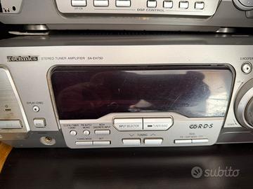 Stereo hi-fi Technics composto da amplificatore, sintonizzatore radio, doppio lettore cassette, lettore CD x 6, 4 casse con woofer e subwoofer. Da riparare.