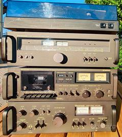 Impianto Tecsonic in buone condizioni, composto da Amplificatore (mod.A-9009), cassette deck (D-8009), Giradischi (P55), Tuner (T-7090). Il giradischi ha problemi con la rotazione, anche se l'alimentazione e componentistica è funzionante. Privo di diffusori/casse. Disponibile a parte mobile nero in legno per l'impianto, altezza 80 cm circa, preferibile consegna a mano in zona Torino nord o ritiro nel ciriacese. Considerata dimensioni e peso complessivo la spedizione si aggira intorno ai 30€