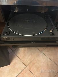 Bellissimo impianto stereo completo di mobile in legno, possiede un lettore CD, un lettore cassette, e piatto per vinili, più due casse amplificatrici. Prezzo trattabile.