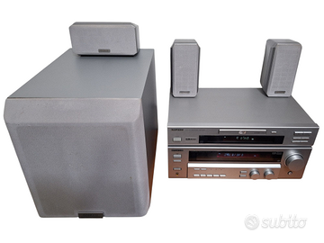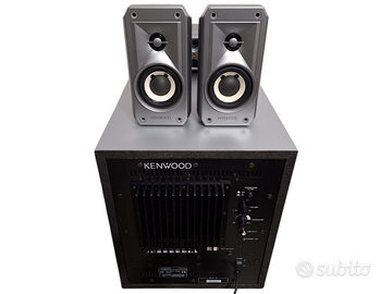 Stereo 3.1 home teatre Kenwood con cavi di collegamento composto da sintoamplificatore Kenwood KRF-V4070D potenza 5 X 70 W RMS, lettore CD-DVD-MP3 Kenwood DVF-3070, subwoofer Kenwood SW-37HT da 20 CM doppia bobina da 100 W RMS con crossover elettronico escludibile e regolabile e standby automatico, 2 satelliti più centrale Kenwood KS-307, tutto perfettamente funzionante a 260 euro. Presenta segni di usura. #Surround Dolby Digital DTS Pro Logic II
