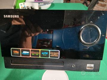 stereo compatto samsung, radio, lettore cd e lettore usb, sul fronte uscita per cuffie, sul retro uscita antenna (in dotazione), cavo per casse, cavo alimentazione uscita aux.