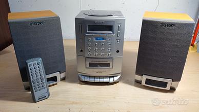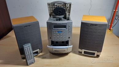 Stereo mini-hifi vintage Sony, con radio, lettore CD e mangiacassette. Due casse singola via. Perfettamente funzionante