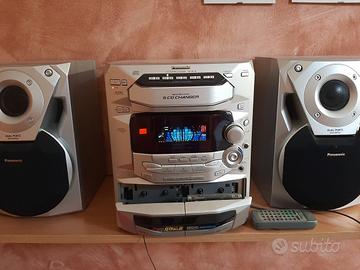 Stereo Panasonic, radio , doppie cassette, carico cinque CD, altoparlanti e telecomando.