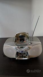 stereo con radio, CD e cassetta, funziona con corrente ma anche batterie. Funzionate, solo cassette per noi non verificabile perché non ne abbiamo. colore grigio.