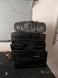 Set componenti hi‑fi Pioneer (amplificatore, tuner, lettore CD, doppia piastra cassette ecc.) con radio portatile Fenner in regalo. Fermi da anni, da provare e pulire. Ideale per appassionati o ricambi. Vendo solo in blocco, ritiro a mano.