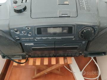 BOOMBOX BLASTER PHILIPS AZ-8304 VINTAGE RADIO STEREO CD doppia cassetta in condizioni buone, un mangiacassette funziona e un altro ha una portella del mangiacassette che è da sistemare.