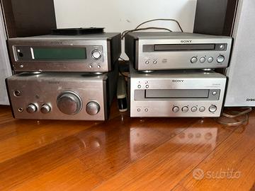 Impianto stereo Sony, con casse e telecomando. Radio, lettore c.d., amplificatore, due speakers, lettore cassette e antenna.