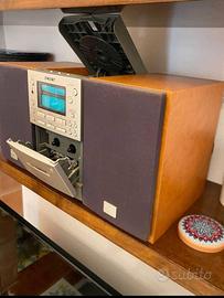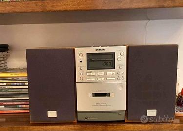 Lo stereo e il Subwoofer sono perfettamente funzionanti ed è dotato di telecomando, esso e le 2 casse sono profondi 23 cm, larghi 13 cm, alti 21 cm . Il Subwoofer profondo 25 cm alto 21 cm e largo 22 cm.Sono rivestiti in radica di noce chiaro