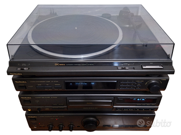 Stereo Vintage Technics produzione anni 90 composto da amplificatore SU-V500 potenza 2 X 30 W RMS, lettore CD SL-PG490, sintonizzatore tuner ST-GT350 e giradischi turntable SL-BD20D senza testina, revisionati e perfettamente funzionanti a 370 euro. Presentano alcuni segni di usura.