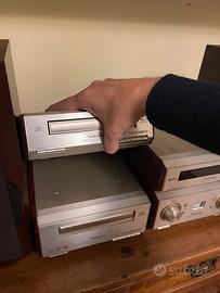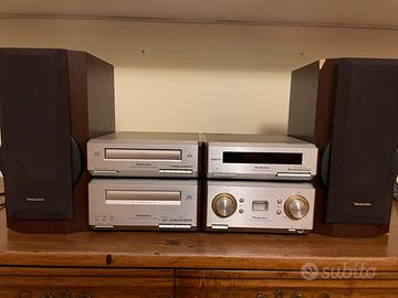 Vendo impianto stereo compatto Technics SC-HD550 a componenti separati di alta qualità, perfettamente funzionante e ben conservato. Unico difetto estetico sul bordo di una cassa ( vedi foto) . Il sistema è composto dai 4 moduli originali: • Amplificatore SE-HD550 • Sintonizzatore Radio ST-HD550 • Lettore CD SL-HD550 (Sistema MASH) • Piastra per Cassette RS-HD550 Sono incluse le casse -Coppia di diffusori SB-HD550, il Telecomando originale, i cavi di alimentazione, cavo di collegamento tra i moduli e antenna. Vendo con ritiro a mano ( zona Roma nord) .