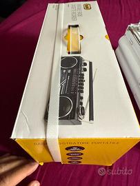 Il radio registratore ha la forma del classico boombox anni Ottanta lungo e rettangolare con maniglia di trasporto ed altoparlanti rotondi sui due lati. In dotazione include una radio a 4 bande con ricezione tramite antenna allungabile.