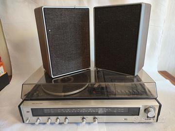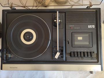Sistema stereo compatto Modello 6970: Si tratta di un modello Vintage degli anni ’70 che combinava diverse funzioni. E’ inutilizzato da anni per cui ci saranno le cinghie del giradischi da cambiare ed il tasto REC bloccato ma per il resto è funzionante. Prodotto delicato e con casse troppo voluminoso per la spedizione