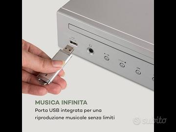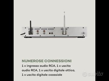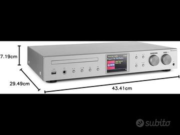 Auna iTuner CD - Streamer Radio DAB etc Incredibile qualità/prezzo per questo raffinato ed elegante componente hifi con le seguenti funzioni: Lettore CD, Streamer Spotify Direct, Radio Internet/DAB con più di 20.000 stazioni emittenti, tra cui Radio Swiss Jazz e tutte le altre con generi musicali dedicati, lettore USB, radio FM, Sveglia. Collegabile direttamente sia al vostro amplificatore hifi, che preamplificatore. Collegabile al vostro DAC esterno mediante cavo COAX, oltre che via LAN direttamente al vostro router domestico. Antenna fm e telecomando.