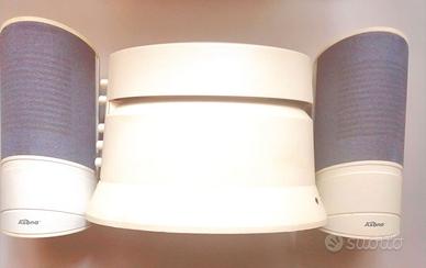 Kit di casse e sub-woofer amplificati con comandi e regolazioni sul frontale del sub-woofer. Il kit di estetica moderna e gradevole si presta a vari usi.