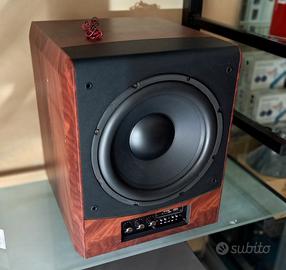Subwoofer amplificato uso domestico; cono da 32 cm , 200watts; crossover regolabile sia per Frequenze basse che per Frequenze d' incrocio uscite pilota preamplificate. Nuovo ma con piccole scalfiture laterali lato sinistro , evidenti in foto. Senza pannello frontale in Tela