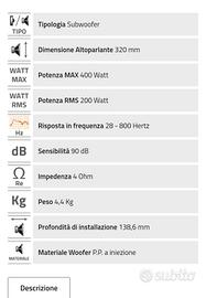 vendo subwoofer Kenwood amplificato in ottime condizioni con 200w in RMS 400w di picco, misure della cassa cm 44x40x20