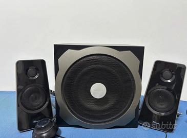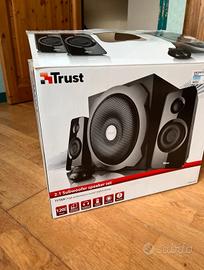 sistema 2.1 Trust , composto da subwoofer attivo, e due altoparlanti, suono potente e pulito con bassi profondi, 120 W , ideale per TV, consolle giochi, e anche per sentire musica dal cellulare tramite il jack cuffie, in ottime condizioni