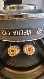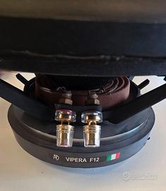 AD Audio Development F12.1 VIPERA Subwoofer 30cm cono in carta e fibra vetro Il sub F12.1 mono è progettato e creato per soddisfare i fan dell' SPL mantenedo un'alta qualità, ed è adatto agli allineamenti in bass-reflex o band-pass. Può inoltre sopportare forti accelerazioni senza deformarsi. Caratteristiche F12.1 mono Cono: Carta / fibra di vetro a doppio strato, lavorazione unica effettuata all'interno dell'azienda con l'obbiettivo di minimizzare la flessione del cono e ripristinare il movimento a pistone ideale. Sospensione: Gomma butilica termo-formata Centratore: Due pezzi in conex Bobina: Bobina in rame OFC su supporto in fibra di vetro (diamentro 65mm), ventilazione forzata attraverso magnete. Cestello, Magnete: Alluminio con numerose nervature di rinforzo, anello di ferrite ad alta saturazione.