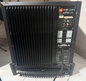 Sub attivo JBL SUB300" da 150 Watt 8ohm da 30 HZ a 120. Cono da 254 mm. Dimensioni 508x349x400. Peso 15 Kg. Sistema Cinema 5+1 HiFi.Uscite amplificate per 5 casse (2 anteriori-2 posteriori-1 centrale) Compreso di casse.