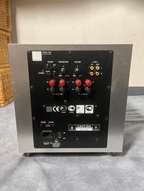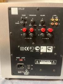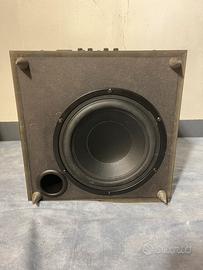 Subwoofer attivo Ceratec Code 1106 Versa, un componente audio di alta gamma progettato in Germania. Il dispositivo è perfettamente funzionante e in ottime condizioni estetiche. Offre bassi profondi, veloci e controllati, ideali sia per un impianto Hi-Fi stereo che per un sistema Home Cinema. Specifiche Tecniche: •Potenza: 120 Watt. •Woofer: 20 cm (8 pollici) con emissione verso il basso (Down-firing). •Controlli Posteriori: Regolazione Volume, Crossover variabile (40Hz-160Hz) e Selettore di Fase (0/180°). •Funzioni: Accensione automatica (Auto-Power) al rilevamento del segnale. •Ingressi: RCA (Line In) e ingressi ad alto livello (Hi Level In) per collegarlo anche ad amplificatori senza uscita sub dedicata. •Dimensioni: Compatte e solide, ideale per chi cerca prestazioni senza ingombri eccessivi.
