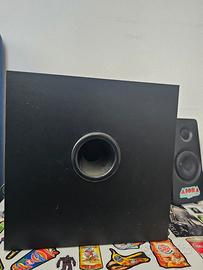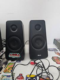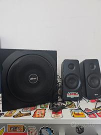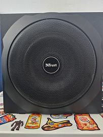 Subwoofer con coppia di casse marchio Trust, ideali ler essere collegate al computer o portatile.