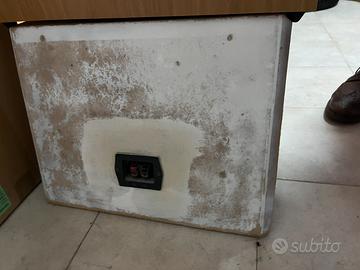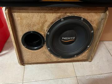 Il diametro del cono è 24cm, l’altoparlante è incollato con il silicone e avvitato con le viti alla cassa, perciò non conosco la marca del sub.