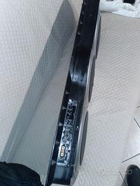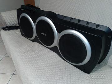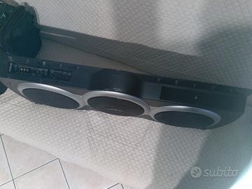 Subwoofer amplificato in cassa chiusa - Infinity BASSLINK T CASSA ATTIVA AMPLIFICATA INFINITY CON TRIPLO SUB DA 25 CM 3 x 10" CON AMPLIFICATORE INTEGRATO CASSA DA 102,6 CM DI LUNGHEZZA ULTRE SLIM SOLO 16,4 CM DI PROFONDITA' CARATTERISTICHE: Subwoofer attivo, in cassa chiusa (isobarica), con amplificatore integrato. Sistema con driver principale attivo (centrale) e doppi radiatori passivi (laterali). Questa configurazione è studiata per "massimizzare la resa", in relazione al piccolo spazio. Cassa di forma compatta, che permette installazioni in posizioni altrimenti inutilizzabili. I posizionamenti consigliati sono dietro gli schienali, a pannello o in orizzontale nel baule. Le griglie protettive dei woofer permettono di poterci appoggiare sopra gli oggetti in sicurezza. Potenza RMS 250W X 3 Diametro dei subwoofer 10" (pollici) - 25 cm - 250 mm. Risposta in frequenza 20 Hz / 120 Hz. Ingressi per il collegamento audio stereo in formato RCA standard (2 connettori). Ingressi ad alto livello, per collegare il sub direttamente alle uscite di potenza dell'autoradio. Compatibile quindi con tutte le autoradio, anche quelle di serie, senza uscite pre-out rca. Funzione "auto turn-on" per accende il sistema in presenza di segnale musicale. Controllo regolabile del "guadagno" in ingresso. Controllo regolabile del "taglio crossover" da 50 Hz a 120 Hz (12 dB/ottava). Controllo regolabile "bass boost", per enfatizzare i bassi @ 40Hz da -6dB a +3dB. Selettore per l'inversione di fase, selezionabile tra 0° e 180°. Connettori di alta qualità, placcati. Telecomando con cavo, per il controllo remoto del volume, posizionabile a piacere. Comprese "staffette" e accessori per il montaggio. Dimensioni indicative (LxAxP) 103x37x16 cm. Astenersi affaristi a vuoto e perditempo grazie