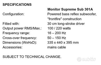 le caratteristiche le trovate in ultima foto. lo levo perché ho ridotto l'impianto. funziona perfettamente, qualche segnetto, ma posizionato non si nota. era un sub da 300 euro nuovo, tanto per capire. non spedisco