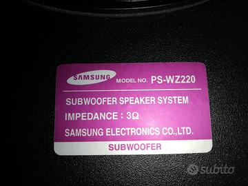Subwoofer passivo Samsung model no Ps-wz 220, impedenza 3 ohm, potenza 100 watt, perfetto pari al nuovo solamente testato il funzionamento, compreso di cavo, tutto originale, misure altezza 32.0 cm, profondità 38.0 cm, larghezza 18.2 cm, se digitate lele46 troverete tanti altri articoli in vendita. Il mio recapito telefonico è 3401627993