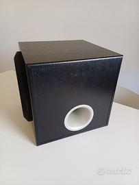 Woofer a cono da 20cm, cassa in legno nero. Risposta in frequenza 28-200Hz.