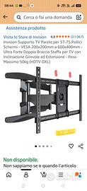 Vendo supporto da parete per TV con doppio braccio con passacavi integrato ,capacità di carico 50 Kg.Ultra forte doppio braccio staffa per TV ad inclinazione girevole ed estensione. Schermi Vesa 200(l)x200mm(a)-600x400mm. 30euro.