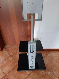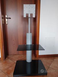Piano superiore e inferiore in vetro, struttura in acciaio verniciato grigio opaco base inferiore 58x43 superiore 45x32. Regolabile in 4 altezze. Altezza massima 123 cm, minima 98