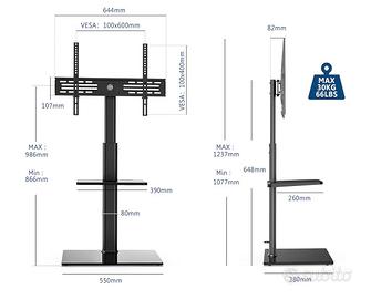 Supporto TV da Pavimento marca FITUEYES per 32-60 Pollici. Girevole 35 gradi e con 8 livelli di regolazione in altezza da. Ripiano per decoder e base da 8mm in vetro temperato. Peso massimo 30kg. Nella foto 5 dettaglio del vetro scolorito.