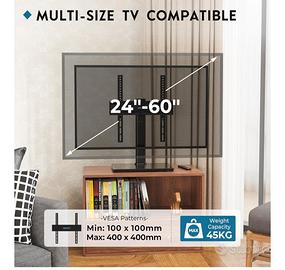COMPATIBILITÀ - La staffa universale è adatta per la maggior parte dei televisori da 24, 26, 32, 37, 40, 42, 47, 50, 55, 60 pollici; Pixel VESA: 100x100 / 200x100 / 200x200 / 300x200 / 300x300 / 400x200 / 400x300 / 400x400mm, compatibile con Samsung, LG Electronics, Sony, Sharp, Panasonic, Philips, JVC, Hitachi, Hisense, TV LCD al plasma LED Toshiba e altri marchi TV. ROTAZIONE E REGOLAZIONE IN ALTEZZA: questo supporto TV può essere ruotato di 50 gradi a sinistra o a destra per ottenere un angolo di visione più ampio.Con 4 livelli di regolazione in altezza, il braccio di montaggio può essere regolato a 2 altezze di 50 mm e la piastra di supporto può essere regolata a 2 altezze di 40 mm per ottenere il miglior effetto visivo. STABILITÀ: l'acciaio laminato a freddo di alta qualità è il materiale principale e la capacità di carico massima è di 45 kg, che può fornire un banco di mostra resistente e durevole; Base in vetro di sicurezza temprato da 8 mm con dimensioni di 400 x 260 mm, che può essere utilizzata come luogo di installazione dei componenti AV; I piedini in gomma antiscivolo evitano graffi. GESTIONE DEI CAVI - I portacavi sul retro sono un grande bonus. Sistema di gestione dei cavi per nascondere gli antiestetici cavi, rendendo l'unità di intrattenimento pulita.