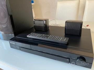 Impianto Pioneer Surround Blu Ray Disc + Radio FM 2.1 completo di subwoofer, 2 satelliti e telecomando, in ottime condizioni. Pioneer MCS-FS131. Tipologia lettore: Blu-Ray player, Tipi di dischi supportati: BD-R, BD-RE, CD-R, CD-RW, DVD+R, DVD+RW, DVD-R, DVD-RW, Formato di riproduzione: Blu-Ray audio, Blu-Ray video, CD audio, CD video, DVD audio, DVD video, SACD. Formati video supportati: AVCHD, DIVX, DIVX HD, MKV, WMV. Potenza in uscita (RMS): 510 W, Sistema audio: 2.1, Formato audio integrato: Dolby Digital, Dolby Digital Plus, Dolby Pro Logic II, DTS, DTS-HD. Main unit dimensions (WxDxH): 430 x 349 x 63 mm, Peso unità principale: 3.1 kg, Dimensioni altoparlante satellite (LxPxH): 95 x 90 x 80 mm