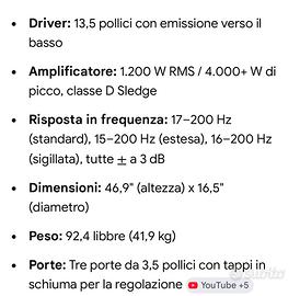 Vendo fantastico subwoofer attivo svs pc4000 Una bestia 1200w rms e 4000w di picco Woofer da 13,5” 35cm Risposta in frequenza 15hz - 200hz +- 3db Altezza 120 Larghezza/profondita 43cm Peso 41kg Dotato di telecomando istruzioni e spugne per i reflex completamente configurabile tramite app da nuovo costava circa 3000€ NO SCAMBI NO PERMUTE NO SPEDIZIONE PREZZO LEGGERMENTE TRATTABILE