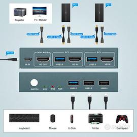 ?KVM Switch HDMI 2 In 1 Out? Con questa KVM Switch HDMI 2 porta, puoi controllare facilmente 2 sorgenti di segnale come computer/macchine da gioco contemporaneamente e condividere 1 monitor con un solo set di tastiera e mouse USB. Può essere ampiamente utilizzato, nella formazione in conferenza, nei giochi, nell'intrattenimento video domestico e nel sistema di protezione della sicurezza, offrendoti un'esperienza di lavoro più efficiente e un'esperienza di intrattenimento più piacevole.