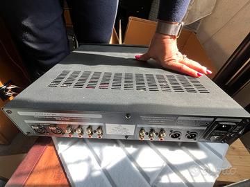 Specifiche tecniche: Ingressi: 4 x sbilanciati (RCA); 1 x bilanciato (XLR) Sensibilità d’ingresso: 5V RMS max Impedenza d’ingresso: 100 kΩ bilanciato (XLR); 47 kΩ sbilanciato (RCA) Valvole: 4 x 6DJ8 / ECC88 Uscite (con accoppiamento tramite trasformatore): 1 x bilanciata (XLR); 2 x sbilanciate (RCA); 1 x sbilanciata REC OUT (RCA) Impedenza d’uscita: 1 kΩ bilanciato (XLR); 470Ω sbilanciato (RCA) Livello d’uscita: 36V RMS bilanciato (XLR); 18V RMS sbilanciato (RCA) Guadagno: +22,5 dB bilanciato (XLR); +16,5 dB sbilanciato (RCA) Risposta in frequenza: 5 – 40 kHz (–3 dB) Distorsione: < 0,1% (20 Hz – 20 kHz @ 1V RMS) Rapporto segnale/rumore: > 90 dB (ponderazione “A”) Diafonia: > 80 dB Alimentazione: 100, 117, 230, 245 Vac ±10%; 50/60 Hz (vedere etichetta posteriore) Consumo: 60W max; < 0,5W in standby Uscita cuffie – impedenza d’ingresso: > 16Ω, driver ad alta fedeltà Uscita cuffie – potenza in uscita: > 300 mW (32Ω) Uscita cuffie – risposta in frequenza: 5 – 40 kHz (–3 dB) Uscita cuffie – distorsione: < 0,1% (20 Hz – 20 kHz) Uscita cuffie – rapporto segnale/rumore: > 95 dB (ponderazione “A”) Uscita cuffie – guadagno: +22,5 dB Dimensioni (L x P x A): 410 × 390 × 95 mm Peso: 10 kg Prezzo indicativo chiedere informazione, prezzo da nuovo 4940 eur, doppio imballo scatola originale